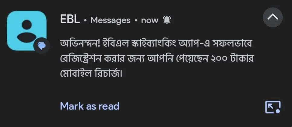 EBL-এর সাম্প্রতিক ঘোষণা অনুযায়ী, Skybanking-এ নতুনভাবে রেজিস্ট্রেশন করলে নির্দিষ্ট শর্ত পূরণের পর গ্রাহক সরাসরি ২০০–৩০০ টাকার ক্যাশ রিওয়ার্ড পাবেন।